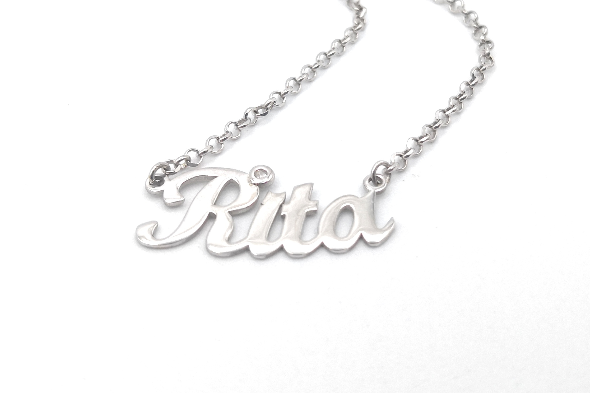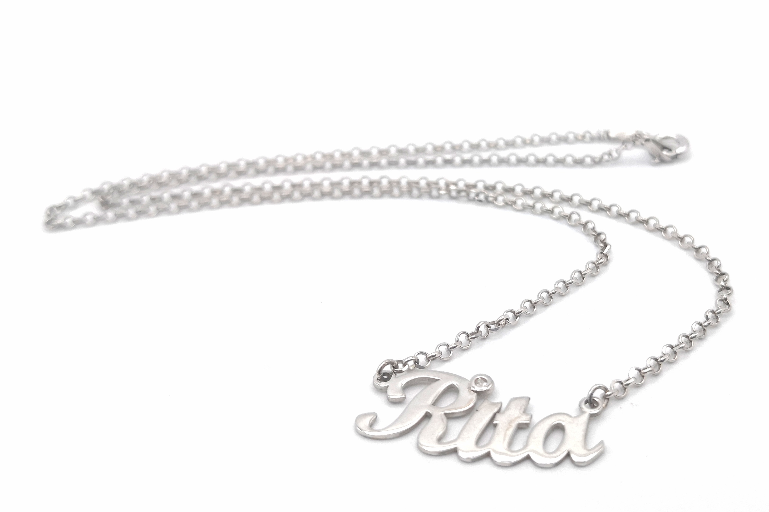Collana realizzata in argento 925;è possibile scegliere la misura della collana(tra quelli proposti nel depliant allegato) e se si preferisce avere il nome lineare o leggermente curvato.