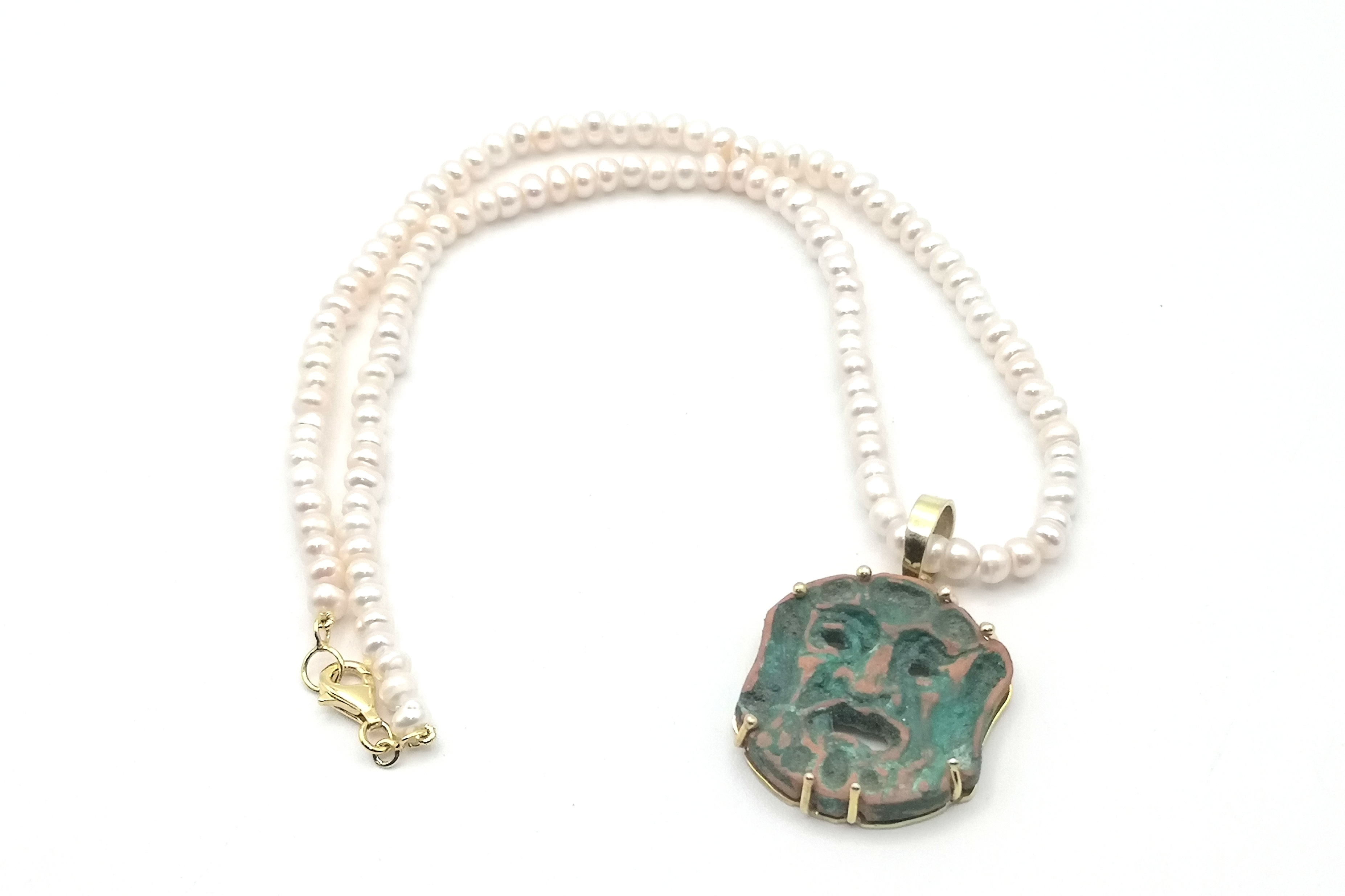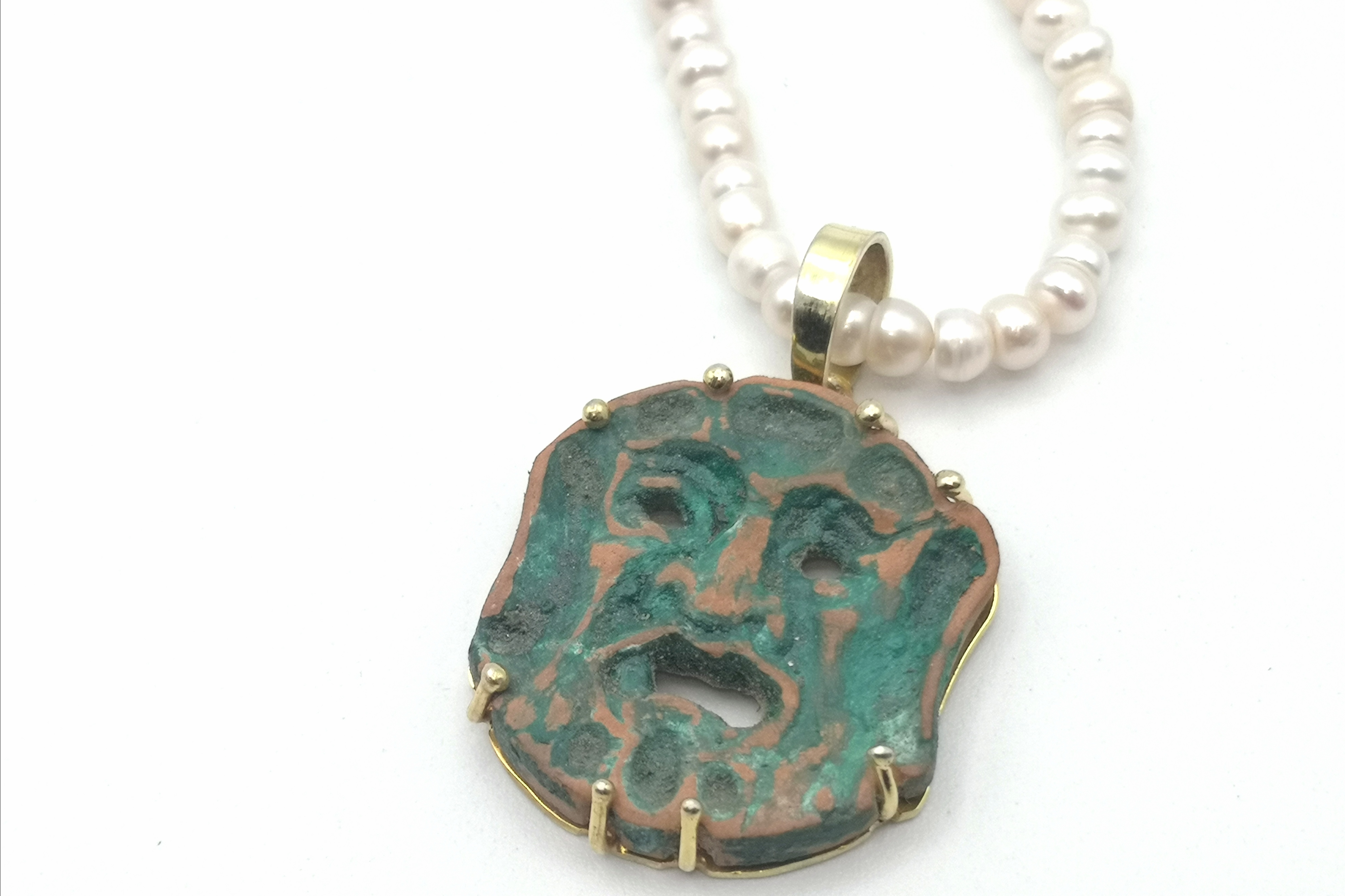 Riproduzione di una maschera apotropaica in argilla e argento dorato, con filo di perle di fiume.Grottesche raffiguzioni, dalle sembianze mostruose ,a cui venivano attribuite funzioni magiche che avrebbero consentito di scacciare gli spiriti maligni;la loro diffusione riguarda diverse regioni del mezzogiorno ed in particolare al folklore Calabrese.