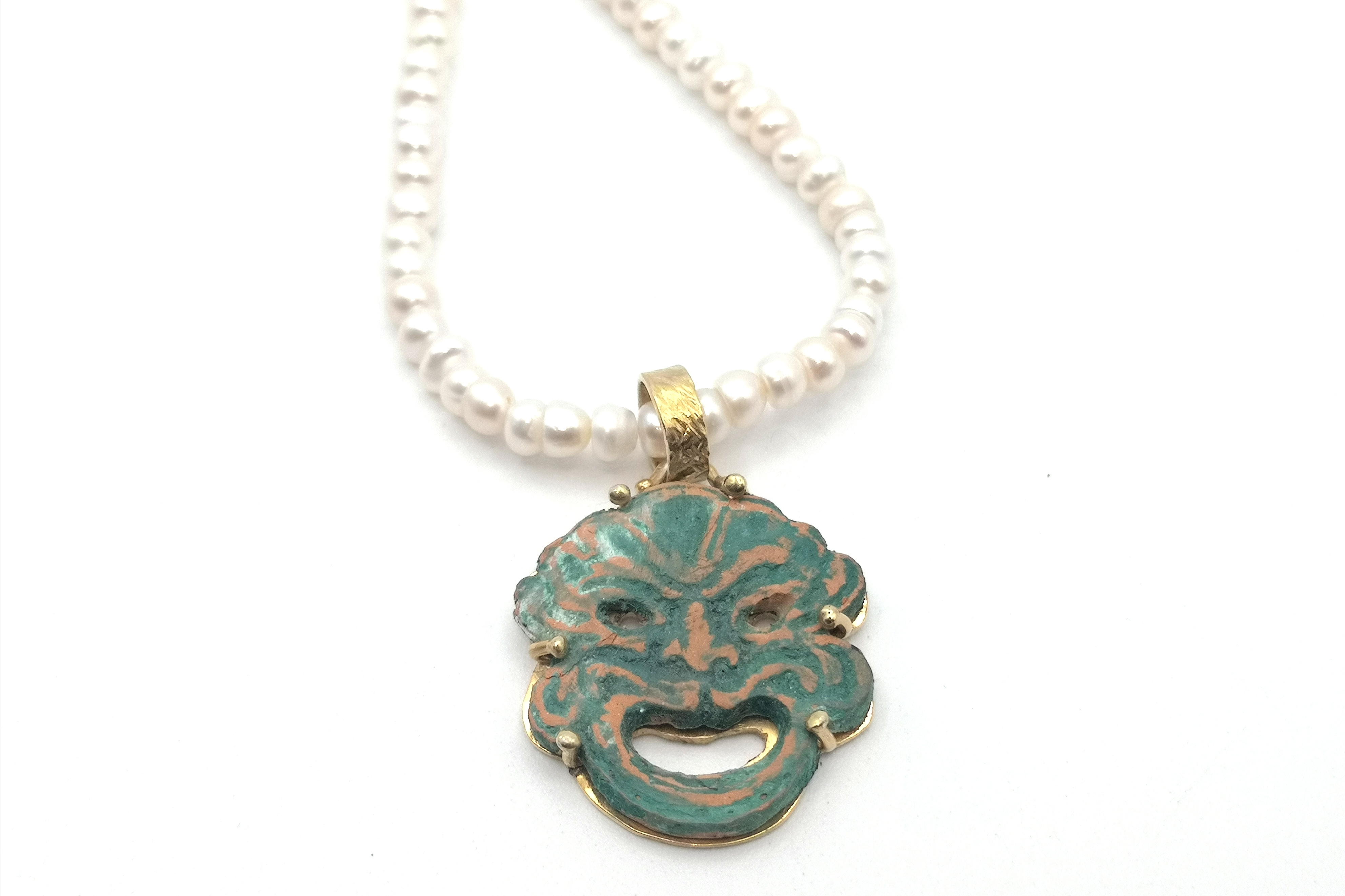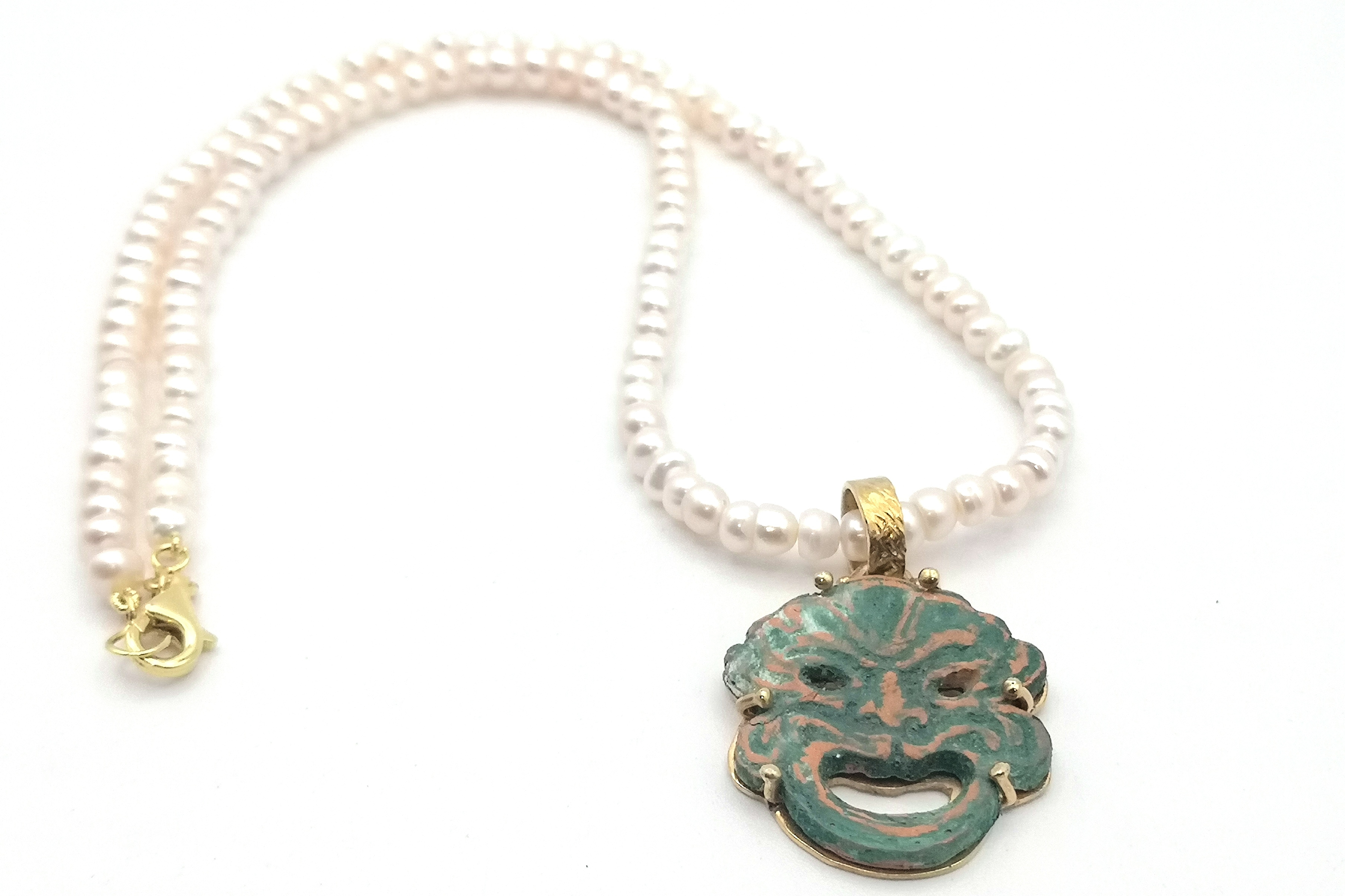 Riproduzione di una maschera apotropaica in argilla e argento dorato, con filo di perle di fiume.Grottesche raffiguzioni, dalle sembianze mostruose ,a cui venivano attribuite funzioni magiche che avrebbero consentito di scacciare gli spiriti maligni;la loro diffusione riguarda diverse regioni del mezzogiorno ed in particolare al folklore Calabrese.