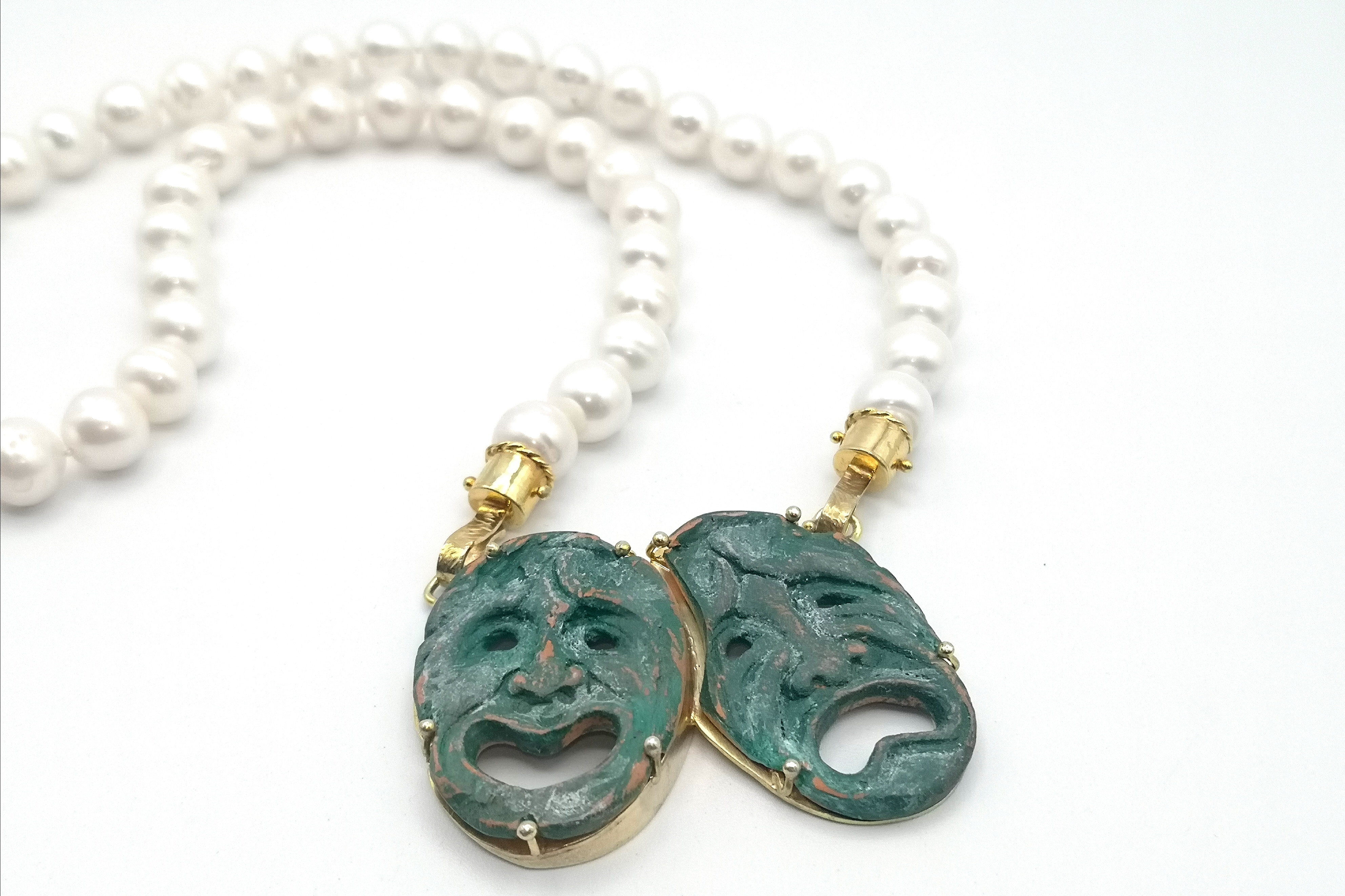 Riproduzione delle maschere greche realizzate interamente a mano ;la collana è in perle di fiume, mentre i pendenti in argilla e argento dorato. Le maschere, quella triste della tragedia e quella allegra della commedia, rappresentano i due distinti caratteri di Dionisio, dio greco, pieno di gioia e convivialità, ma anche incline alla grande tristezza.