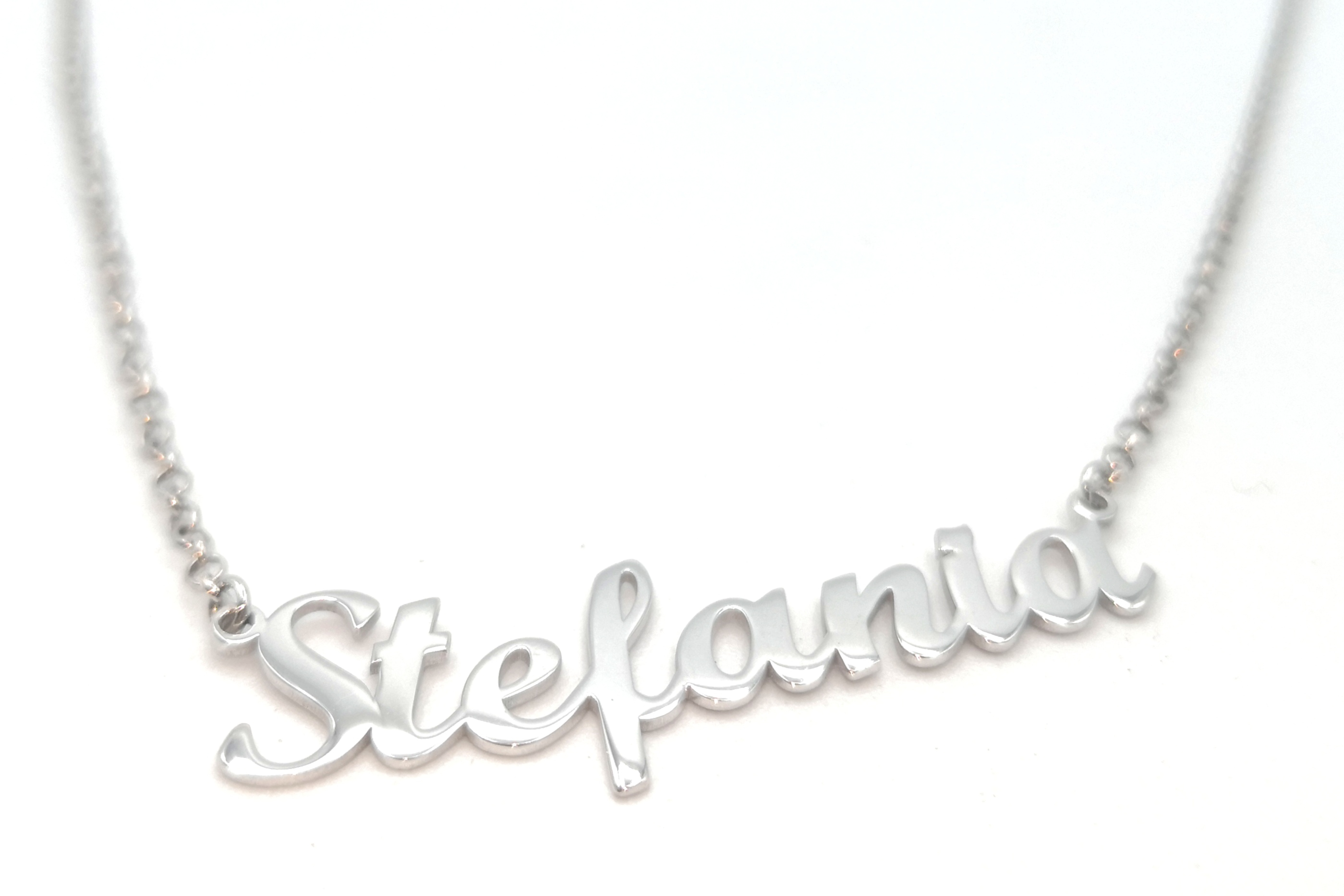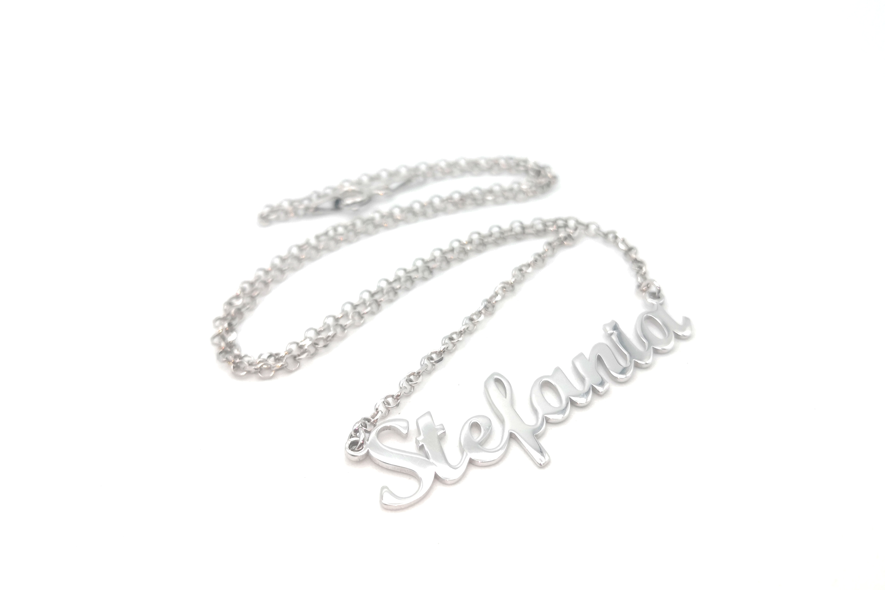 Collana con nome realizzata in argento 925 con incastonato uno zircone;è possibile scegliere la misura della collana,il carattere (tra quelli proposti nel depliant allegato) e se si preferisce avere il nome lineare o leggermente curvato.