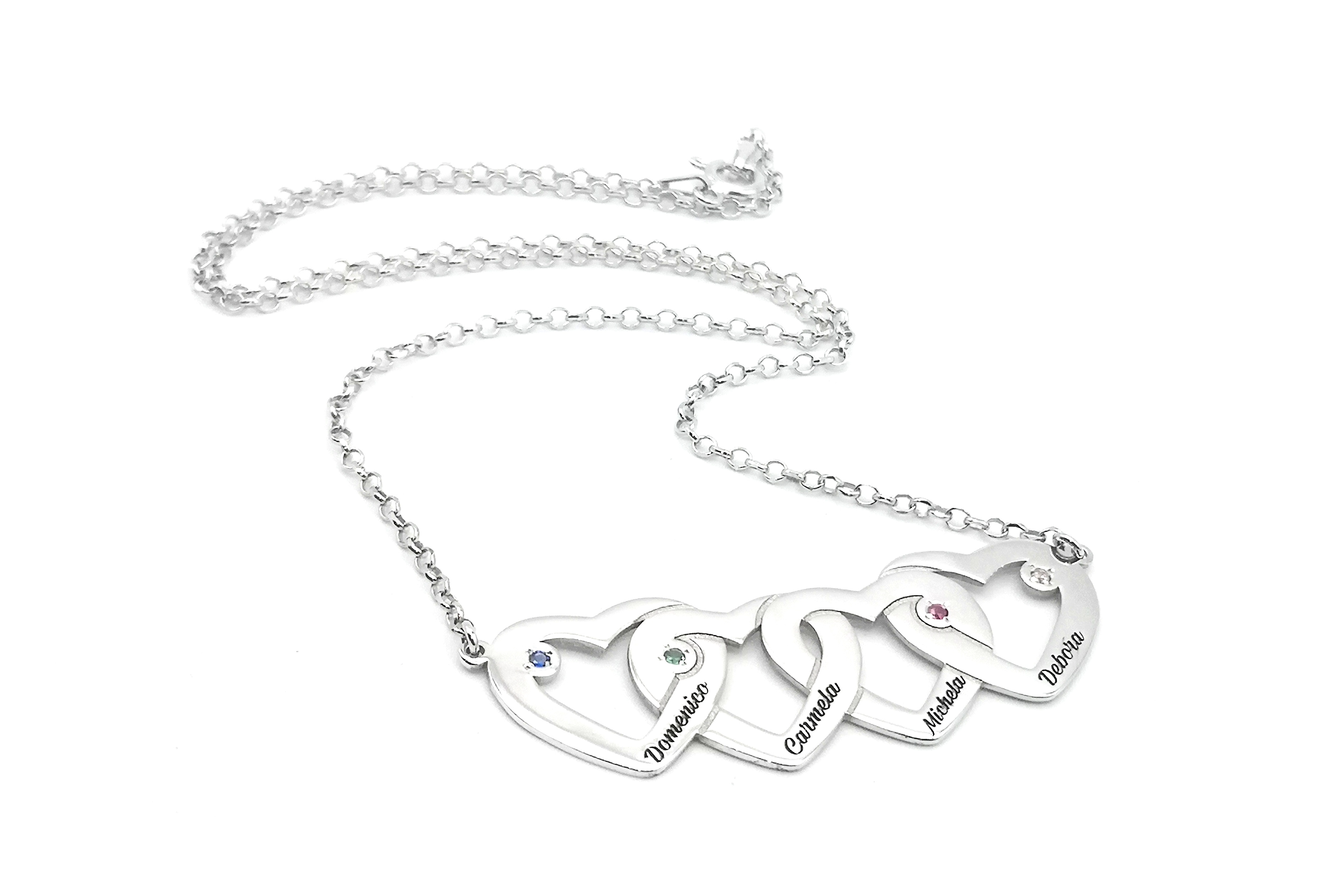 Pendente realizzato in argento 925 con pietre colorate;è possibile scegliere la misura della collana. Confezione regalo inclusa. Consegna prevista entro 15 giorni lavorativi SI PREGA DI INSERIRE I NOMI DA INCIDERE durante il COMPLETAMENTO DELL'ORDINE, al momento del Pagamento nella sezione SCRIVI UN MESSAGGIO AL VENDITORE