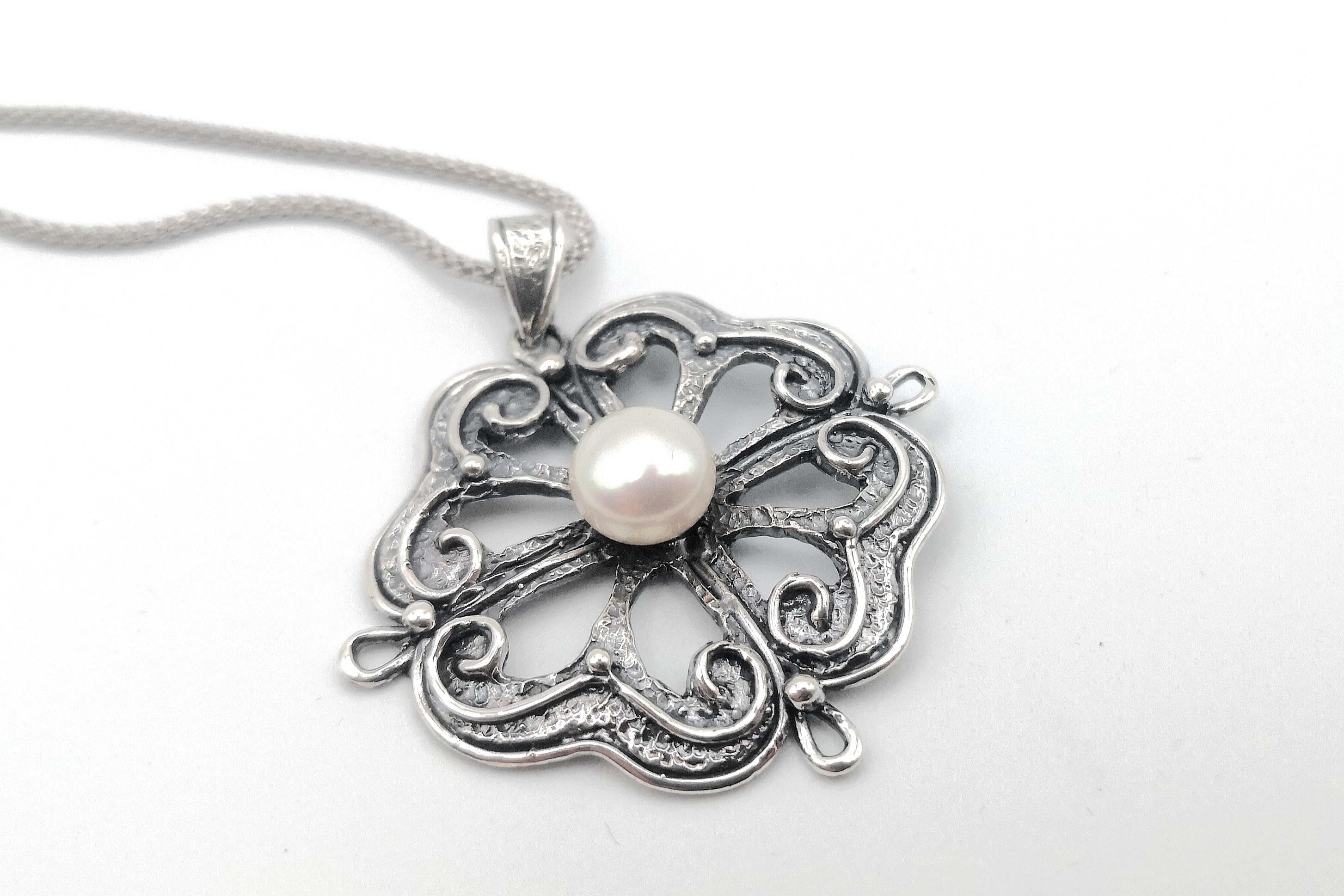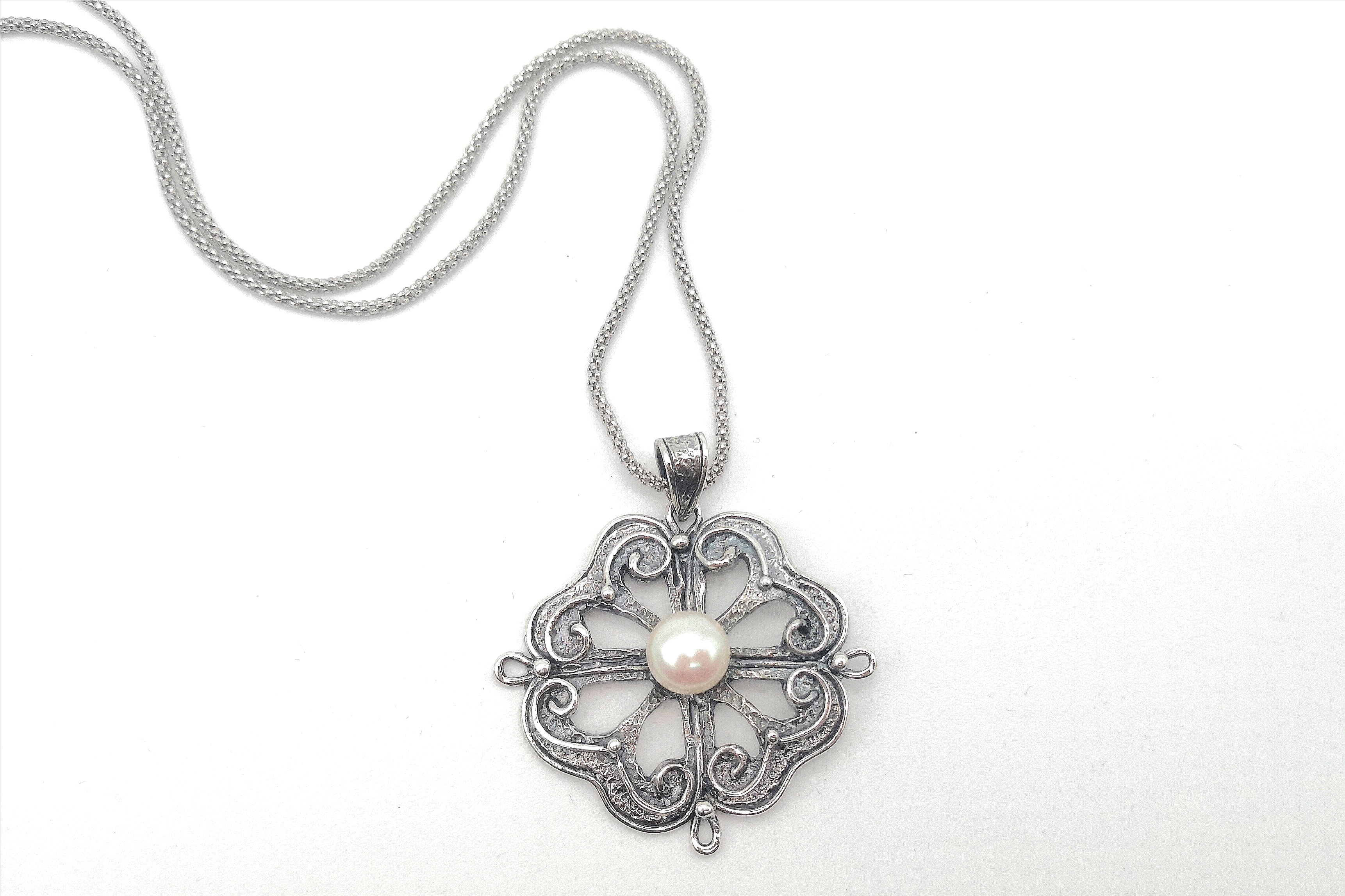 Pendente realizzato in argento brunito con la tecnica della cera persa ed impreziosito da una perla bianca di acqua dolce, qualità gold, a bottone;la lunghezza della catena è 50 cm.