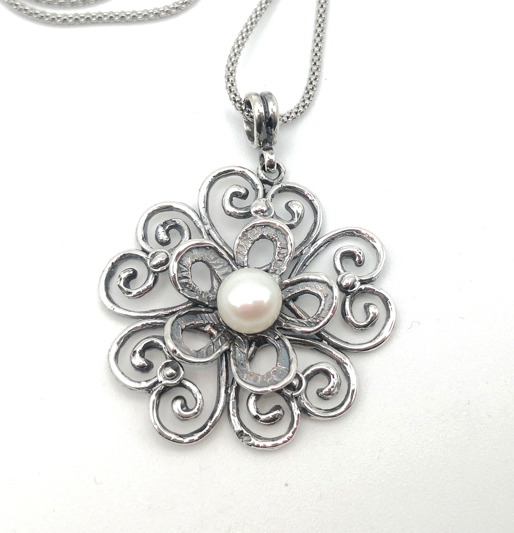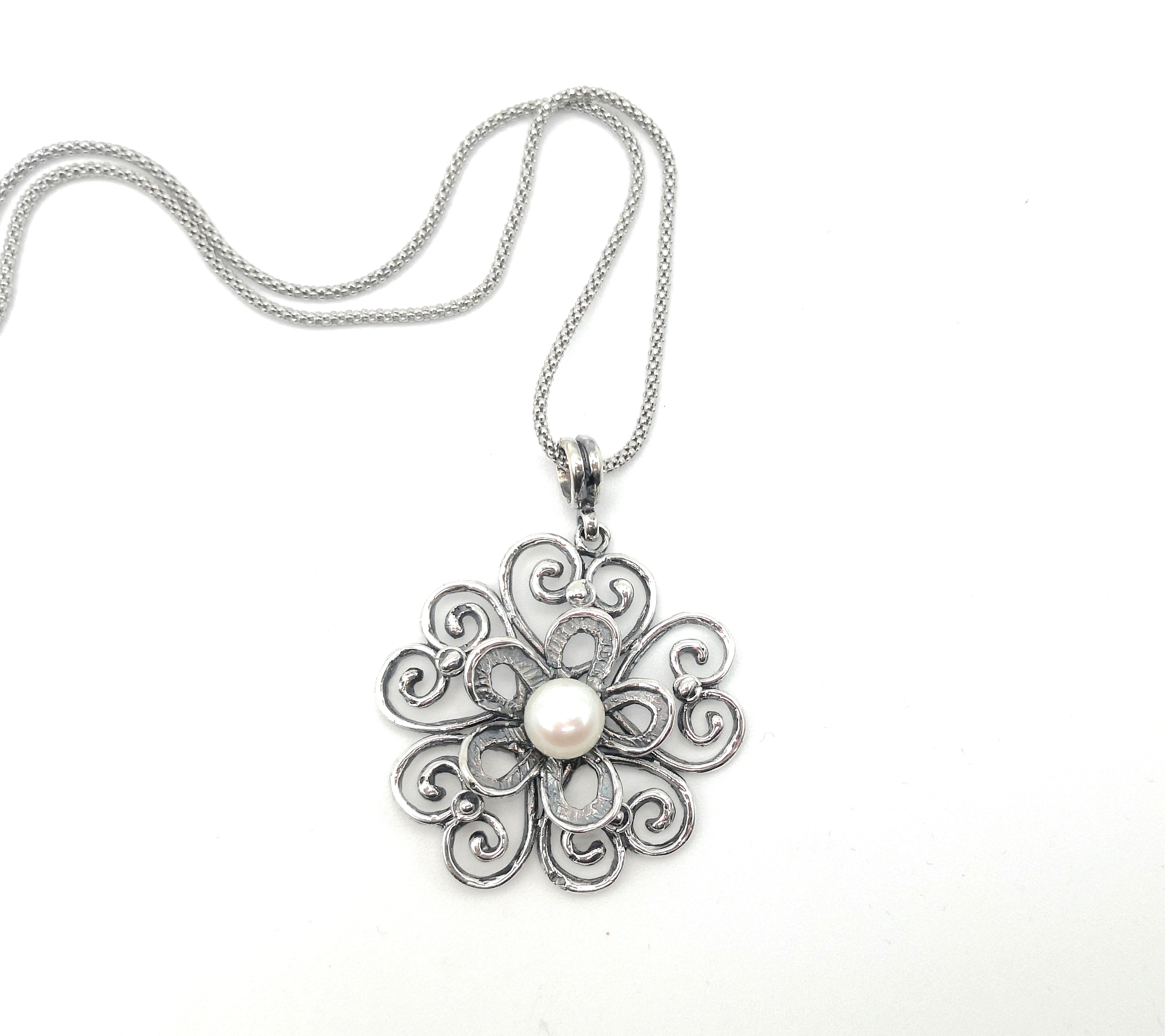 Pendente realizzato in argento brunito con la tecnica della cera persa ed impreziosito da una perla bianca di acqua dolce, qualità gold, a bottone;la lunghezza della catena è 45 cm.