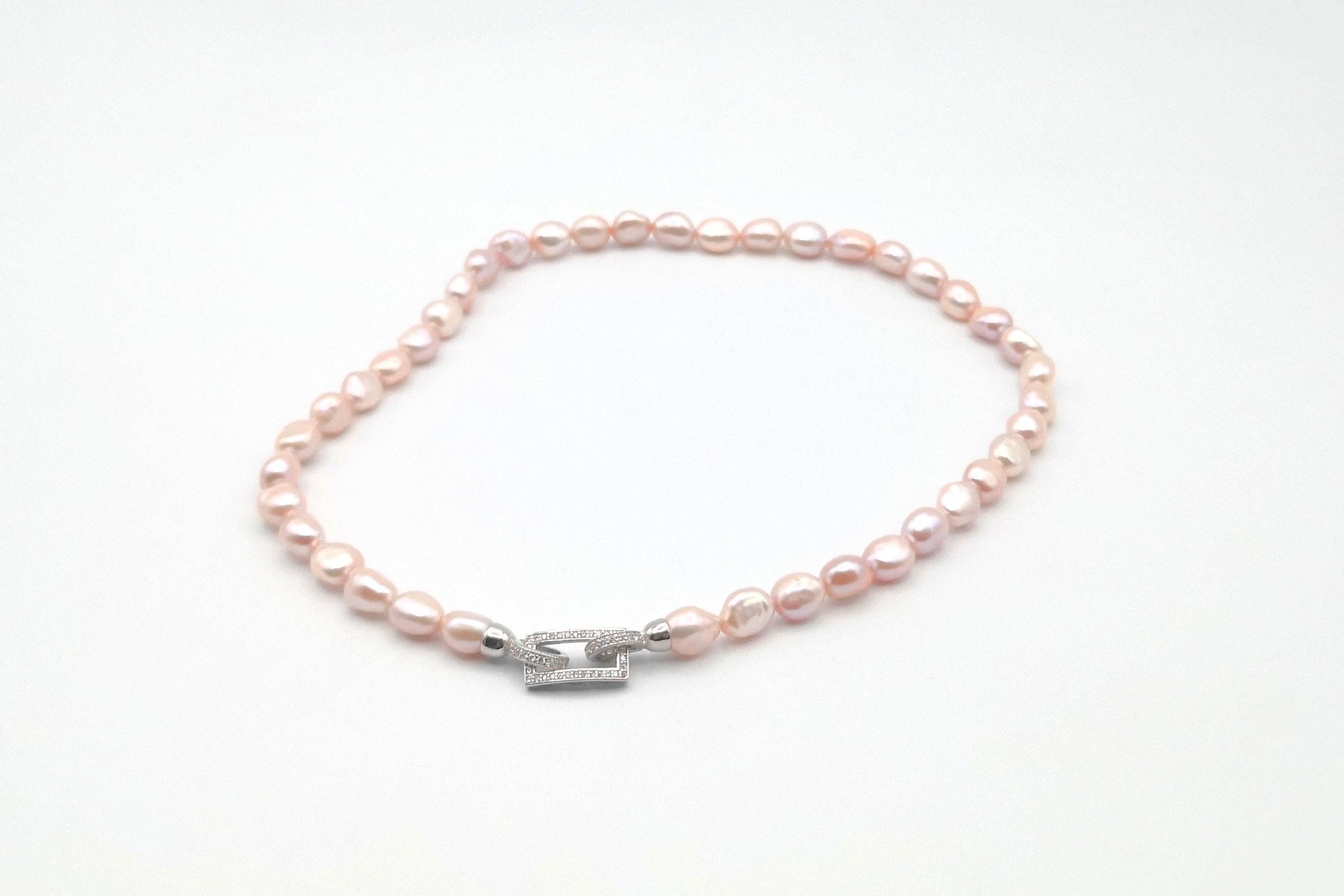 Collana in perle rosa,barocche e irregolari, impreziosita da una chiusura realizzata in argento 925 e pietre cubic zirconia;è possibile scegliere la lunghezza tra quelle proposte.